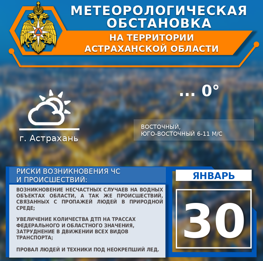 На территории области облачно с прояснениями. Без существенных осадков. Утром местами туман, гололед. Ветер восточный, юго-восточный 6-11 м/с. Температура воздуха около 0°. На дорогах гололедица. По г. Астрахань облачно с прояснениями. Без существенных осадков. Утром туман, гололед. Ветер восточный, юго-восточный 6-11 м/с. Температура воздуха около 0°. На дорогах гололедица.