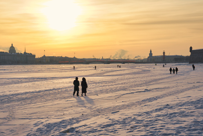 Есть в Питере такой обычай -- местные жители и примкнувшие к ним туристы высыпают на лёд Невы в морозный солнечный день. Правда, буйных с каждым годом всё меньше, и если раньше по Неве бегала толпа народа, то сейчас всего-то несколько десятков набралось. Спасатели здесь же, катаются туда-сюда на своей воздушной подушке, а то мало ли что. Не любят они такие прогулки, если честно, но и не гонят со льда пока. Некоторые идут дальше. Моржующий гражданин залез в прорубь и не хотел выбираться оттуда. Прохожие участливо замечали ему, что, мол, долго ведь сидишь. Но тот отвечал -- норм и даже очень хорошо, что надо бы ещё, проверьте, мол, сами как кайфово. Поверили на слово. Две девушки отправились в дальний путь к другому берегу. Проводили их долгими взглядами. Вроде бы дошли. Можно заглянуть со льда под Дворцовый мост. Перед Эрмитажем тоже народ на льду, Зимнее солнце, наконец, принялось светить и увеличивать день, вечера всё длиннее. Правда, осталась довольно муторная часть зимы, но весна не