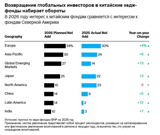 📌 Основные события: Интерес к китайским фондам: В 2026 году 14 % инвесторов намерены направить больше капитала в китайские фонды, при этом около 9 % из них уже сделали это в прошлом году. Отток средств из США: На фоне оттока средств из активов США интерес к вложениям в Китай лишь немного ниже, чем интерес к Северной Америке. Тенденция: В 2023 году 42 % инвесторов вывели капитал из китайских фондов, но в 2026 году наблюдается возвращение интереса. 📊 Контекст: BNP: Опрос показал, что 246 управляющих, которые распределяют средства между хедж-фондами, планируют увеличить вложения в китайские фонды. Геополитические риски: Замедление экономического роста в Китае и ужесточение регулирования отпугнули инвесторов в последние годы. Рост интереса: Прорыв DeepSeek в области искусственного интеллекта в 2025 году спровоцировал рост интереса к китайским фондам. 🗨️ Позиция экспертов: Марлин Найду (BNP): Отметил, что в 2026 году ситуация с китайскими фондами изменится. Диверсификация: Инве