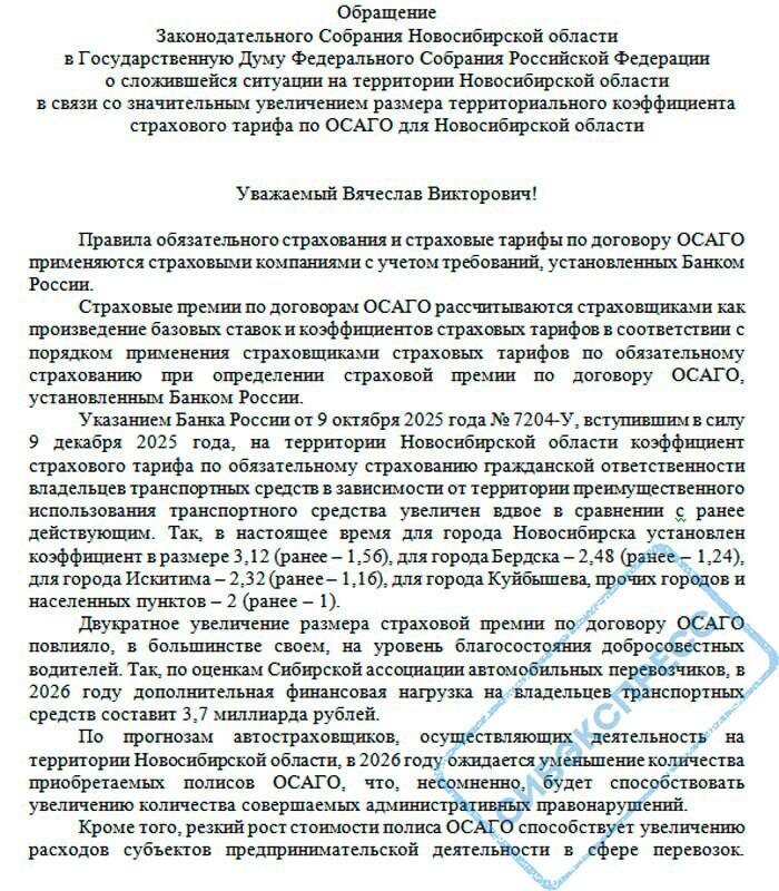 » Новосибирское заксобрание обратилось к федеральным властям с требованием пересмотреть более чем двукратное повышение стоимости ОСАГО для жителей региона. «Сибирский экспресс» публикует копию письма в Госдуму. Аналогичное письмо направлено в Центральный банк РФ. «В условиях сложной социально-экономической ситуации в Новосибирской области депутаты <…> обеспокоены ростом социальной напряжённости в обществе в период проведения специальной военной операции и в преддверии выборов Госдумы», — сказано в обращении. Подписаться| Прислать новость| Помочь бустами