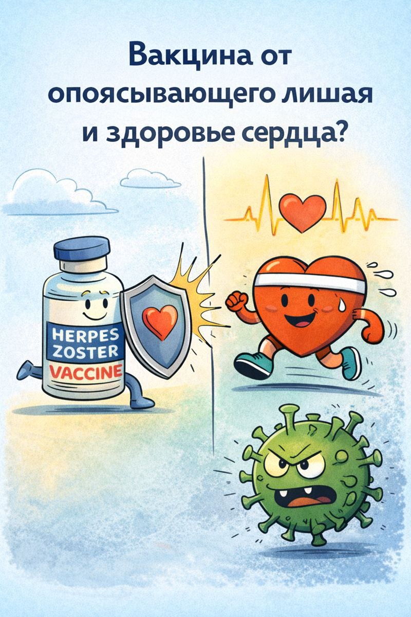 🧠💉 Вакцина от опоясывающего лишая — неожиданная защита для сердца? Мы привыкли думать о вакцинации как о способе избежать инфекции. Но иногда эффект оказывается шире — и куда интереснее. В European Heart Journal вышло крупное южнокорейское исследование, которое заставляет по-новому взглянуть на вакцинацию против опоясывающего лишая (herpes zoster). 📊 Что сделали исследователи? Проанализировали данные более 2 миллионов человек старше 50 лет с последующим наблюдением до 12 лет. Сравнили тех, кто получил живую вакцину против zoster, и тех, кто не вакцинировался. Сравнение было максимально «честным»: использовали продвинутые статистические методы, чтобы группы были сопоставимы по возрасту, полу, болезням, образу жизни и доходу. ❤️ И что получилось? У вакцинированных людей риск сердечно-сосудистых событий был примерно на 23% ниже. Причём речь не о чём-то абстрактном, а о вполне конкретных вещах: • инфаркт и стенокардия • инсульт и ТИА • сердечная недостаточность • аритмии (включая фибри