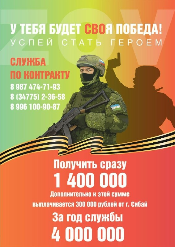 ! Получи сразу 1 400 000 руб + 300 000 руб от г. Сибай Для поступления на службу по контракту необходимо обратиться в военкомат по адресу: г. Сибай, ул. Пионерская, 7, тел. 8-987-474-71-93; 8 (34775) 2-36-58; 8-996-100-90-87. #Сибай #СВО2026