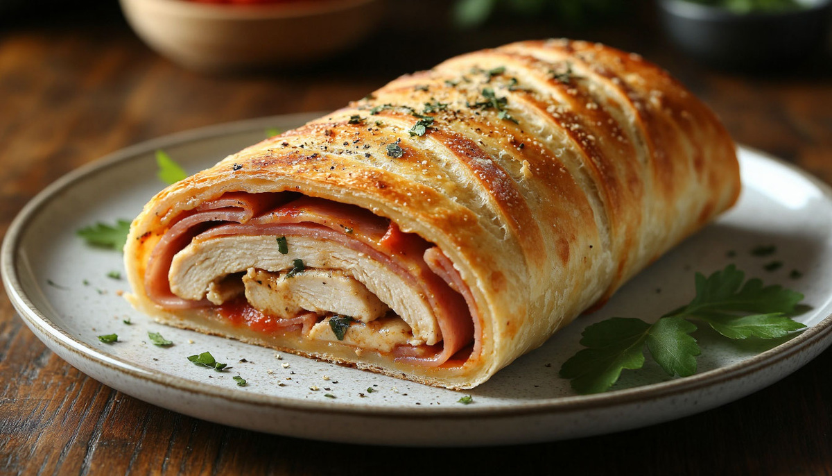 Хотите удивить гостей необычным блюдом итальянской кухни? Тогда приготовьте пикантный рулет из теста с начинкой из курицы, ветчины и сыра. Это блюдо известно как стромболи, получившее своё название благодаря знаменитому вулканическому острову близ Сицилии. Именно там впервые придумали сворачивать традиционную пиццу в аппетитный рулетик. Этот простой рецепт подойдет даже новичкам, ведь готовка занимает всего около часа. Благодаря сочетанию нежной курочки, солоноватой ветчины и тягучего расплавленного сыра ваш ужин станет настоящим гастрономическим праздником. Попробуйте приготовить этот вариант домашнего стромболи вместе с нами! Подавайте стромболи следующим образом: Разрежьте рулет на аккуратные порции шириной около 3 см и подавайте горячими прямо из печи. Можно дополнить свежей зеленью, дополнительным количеством соуса или чесночком по вашему усмотрению. Приятного аппетита и вдохновения на вашей кухне!