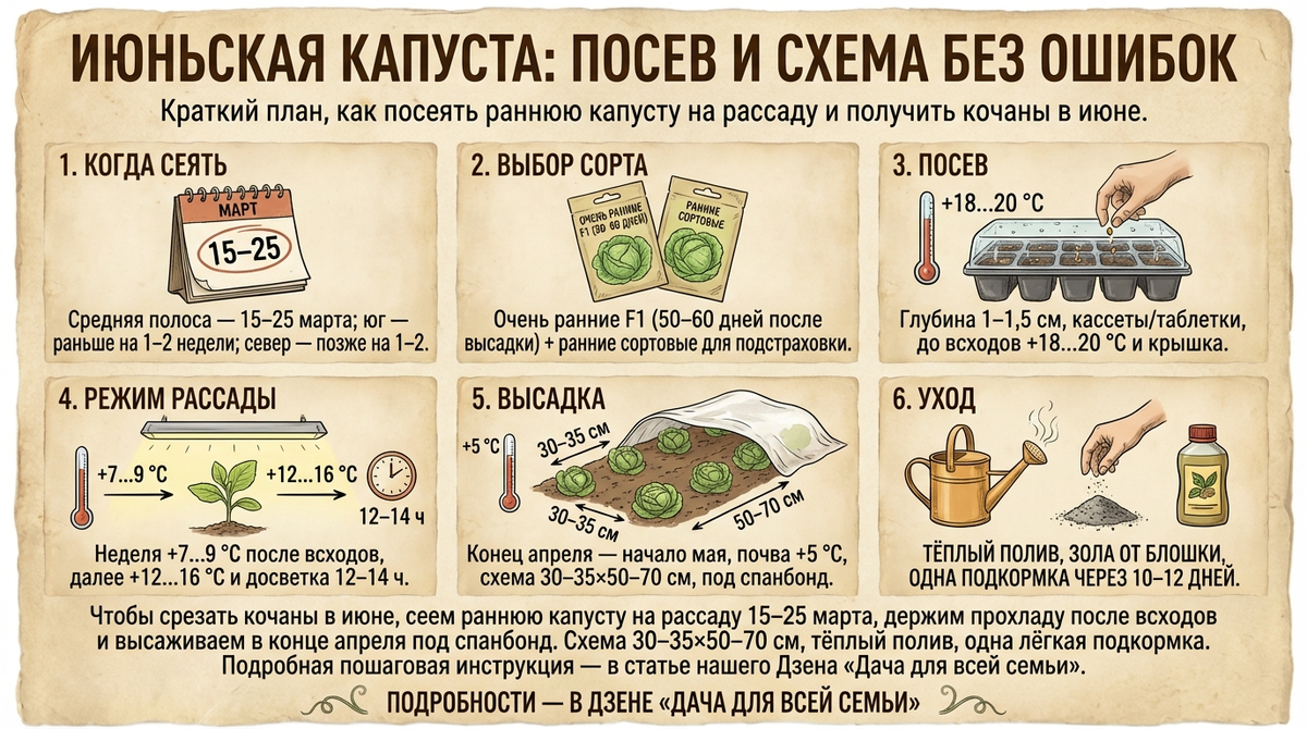 Про прямой посев в грунт. В тёплых южных районах раннюю капусту иногда сеют сразу в открытый грунт под плёнку в конце марта — начале апреля. Для июньского урожая в средней полосе прямой посев рискован: почва остывает, рост тормозится, плюс блоха. Если хочется попробовать, делайте плотный посев в кассеты и переносите вместе с комом — это быстрее и надёжнее.