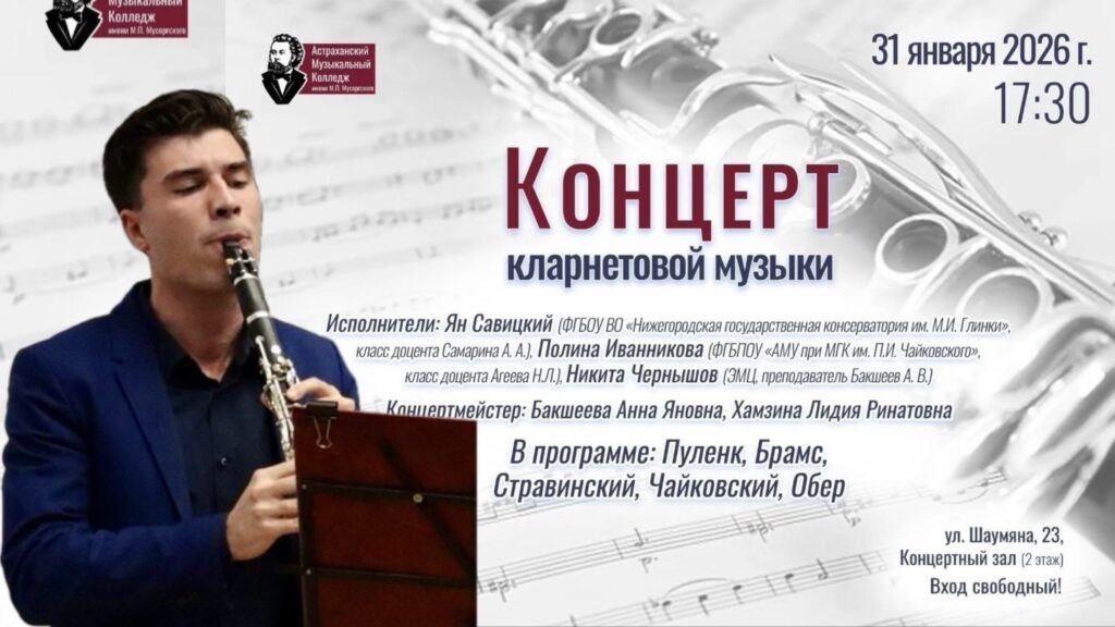 31 января 2026 года в Астрахани состоится концерт кларнетовой музыки. Он пройдет в концертном зале Астраханского музыкального колледжа имени М.П. Мусоргского (ул. Шаумяна, 23, 2 этаж). Начало в 17:30, вход свободный. В концерте примут участие: