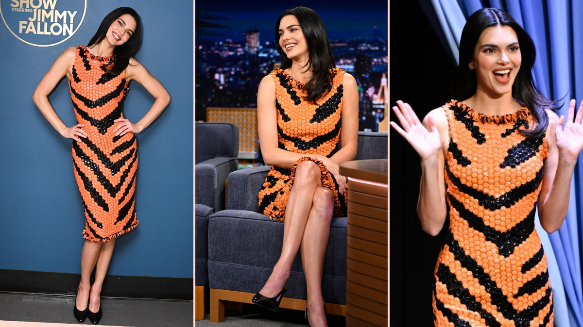 Кендалл Дженнер раскрывает свою внутреннюю кошачью сущность. В среду вечером модель прилетела в Нью-Йорк, чтобы принять участие в шоу "The Tonight Show Starring Jimmy Fallon", надев платье-футляр, покрытое пайетками, из коллекции Métiers d’Art от Chanel. Оранжево-черное платье было создано в стиле бенгальского тигра из пайеток. Она дополнила наряд классическими черными лаковыми туфлями Chanel. Этот образ был впервые представлен на подиуме в нью-йоркском метро в декабре, ознаменовав вторую коллекцию креативного директора Матье Блази для дома моды. Сверкающая текстура платья Дженнер с тигровым принтом символизировала новый образ Chanel в целом, изобилующий твидом, пайетками, ручной вышивкой и бисером. Во время шоу Фэллона модель рассказала о том, что надела культовый наряд с пайетками из "Мулен Руж", выбранный для нее для Vogue World этой осенью, назвав это "сбывшейся мечтой". Модель показала, что платье было не оригинальным, а копией. Более того, Дженнер теперь является гордой о