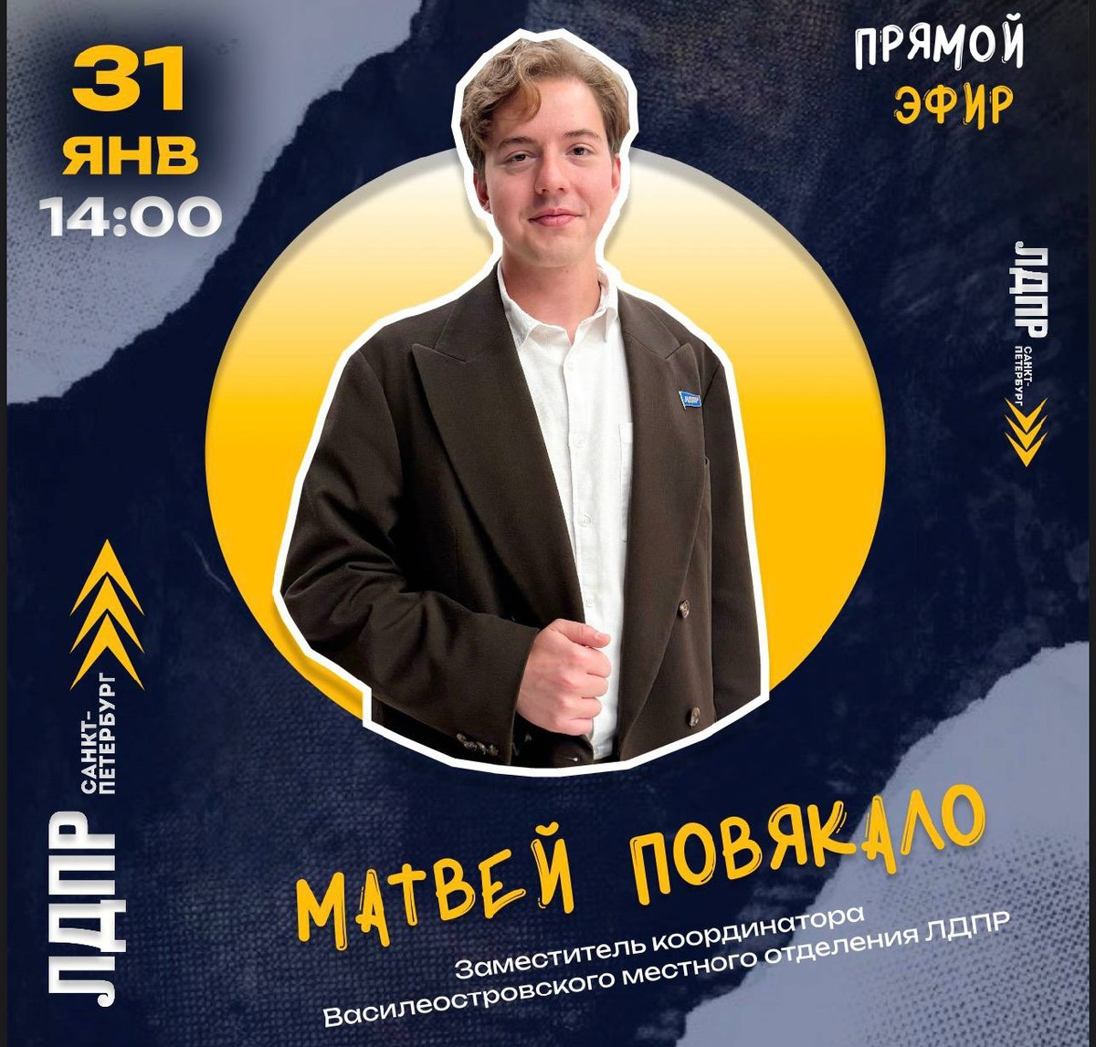 🗓 31 января ⏰ 14:00 Приглашаем вас на прямой эфир с Матвеем Повякало - заместителем координатора Василеостровского местного отделения ЛДПР. 🎓 Тема эфира: «ЛДПР - за достойную жизнь студента!» В ходе встречи обсудим: 👀 проблемы современного студенчества 👀 доступность образования и проживания 👀 поддержку молодых специалистов 👀 инициативы ЛДПР по защите прав студентов Задавайте свои вопросы в комментариях и подключайтесь к трансляции! ЛДПР - за будущее молодежи и справедливые условия для каждого студента! 🔗 Мы ВКонтакте 🖥 Сайт ЛДПР | Санкт-Петербург