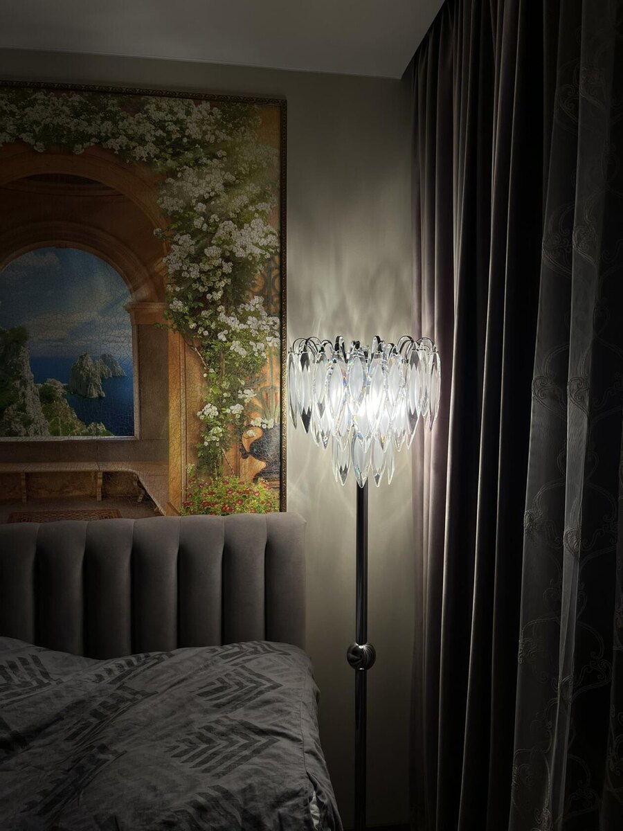 Наш менеджер по продажам Светлана Потёмина(магазин в г. Череповец, ул. Рыбинская, д. 59) подобрала идеальный акцент для спальни— торшер Wertmark Orlanda WE144.04.105.💎 Интерьер сочетает уют и элегантность: стена с живописным панно в стиле средиземноморской виллы, плавные линии серого изголовья и текстурированный текстиль. А главный фаворит— торшер с хрустальными подвесками, который мягко освещает пространство, создавая атмосферу уюта и роскоши. Благодарим нашу клиентку за предоставленную фотографию и за возможность принести свет и радость в Ваш дом! 🌸 Светлана, спасибо за профессионализм и внимание к деталям! 👉 Закажите свой идеальный свет с«Эдисон»!