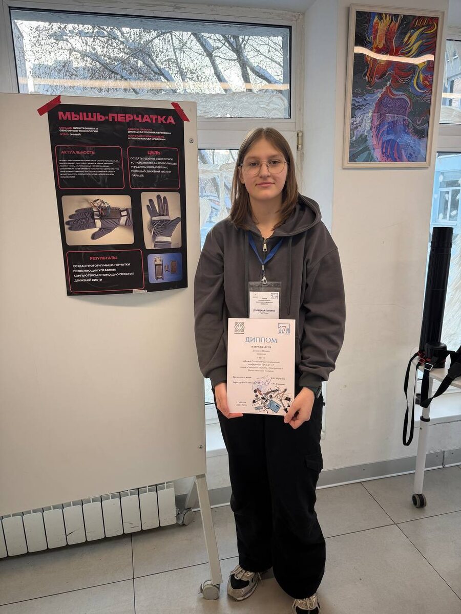🏆 Ученица школы №15 из Балашихи Полина Долецкая победила на первой технологической конференции «ПРОЕКТ-17». Школьница представила свой проект «Мышь-перчатка» в секции «Сенсорные системы, электроника и вычислительная техника». 💻 Полина создала специальное устройство для людей с ограниченными возможностями, которое позволяет управлять компьютером с помощью естественных движений руки и пальцев. Этот изобретение повышает доступность цифровой среды для людей с нарушениями моторики рук. 📎 Первая технологическая проектная конференция «ПРОЕКТ-17» объединила более 50 юных изобретателей. Школьники представляли свои проекты в четырех секциях: «Сенсорные системы, электроника и вычислительная техника», «Искусственный интеллект и распознавание изображений», «Манипуляторы и робототехнические системы» и «Мой первый проект» - для самых младших участников. 📌Оценивало работы профессиональное жюри – специалисты в сфере микроэлектроники, робототехники и искусственного интеллекта, представители Физич