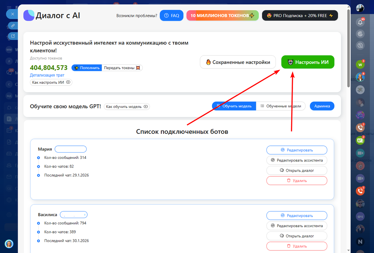 Мы создали простую структуру: объекты, цены и график «Занято/Свободно». Теперь наша задача — сделать так, чтобы бот сам заглядывал в эту таблицу и отвечал клиентам. Это займет всего 5 минут. Переходим в приложение для Битрикс24 «Диалог с AI» и нажимаем кнопку «Настроить ИИ».