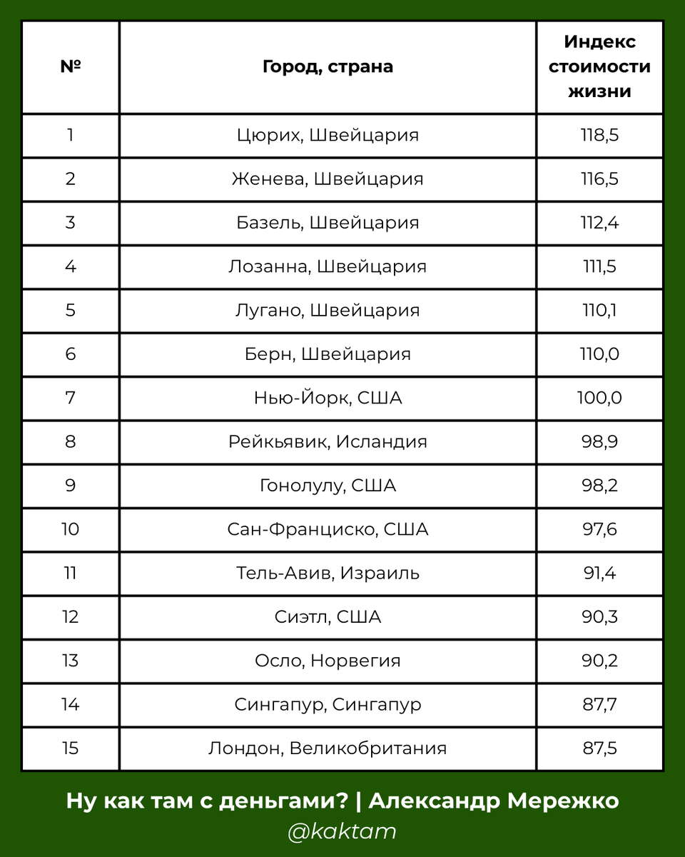 Вышел свежий рейтинг Numbeo по стоимости жизни в городах мира. Москва заняла 290-е место из 479 — примерно середнячок. Для сравнения: самый дорогой город - Цюрих (что интересно, первые 6 городов ТОПа находятся также в Швейцарии), а самые бюджетные - в Индии. Цифры по Москве: Согласно исследованию, одному человеку нужно около 62 000 ₽ в месяц. И это БЕЗ аренды жилья! Только на еду, транспорт, связь и базовые расходы. Звучит неплохо на фоне Нью-Йорка — там жизнь дороже на 50%. Но давайте будем честными: эти цифры очень усреднённые 🤔 Моё наблюдение из практики: За годы работы я общался с сотнями людей из Москвы и регионов. И вот что интересно - реальные расходы сильно зависят от образа жизни: - Кто-то укладывается в 40-50 тысяч (готовит дома, пользуется общественным транспортом) - Другим и 200 тысяч мало (рестораны, такси, развлечения) А теперь добавьте сюда аренду. Однушка в спальном районе - от 40-45 тысяч (если ещё удастся найти такой вариант). В центре - от 70-120 тысяч и выше. Получ