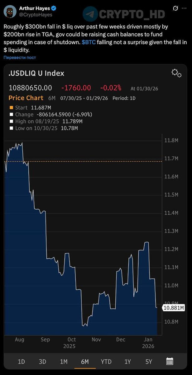 Казначейства США (TGA). Власти активно наращивали финансовые запасы, готовясь к возможному шатдауну. Как только средства поступают на этот счёт, они фактически исчезают из экономического круговорота. Неудивительно, что BTC просел на фоне таких изменений в долларовой ликвидности. Крипто Эстет | Новости криптовалют