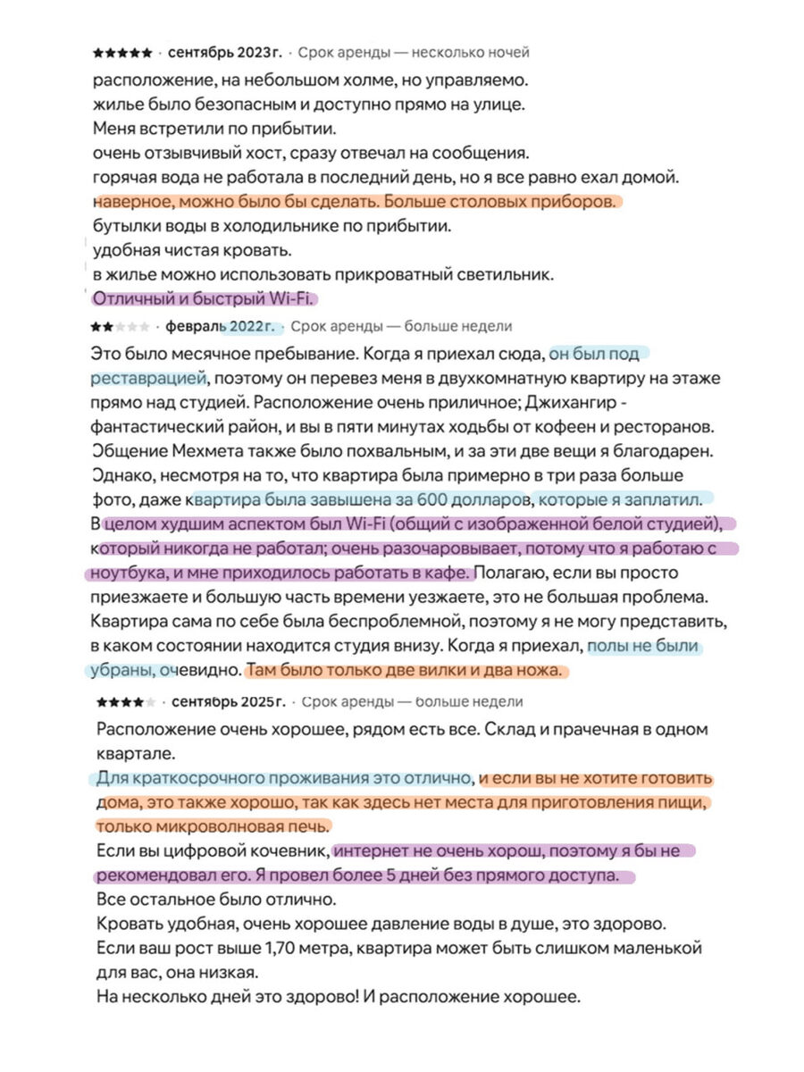 Комментарии к прошлому посту сподвигли меня рассказать про отзывы к стамбульской квартире. Я упоминала, что они спорные. Отзывы в основном хорошие и их много, и на их фоне теряются те, где описаны проблемы. Тут цена была очень привлекательной ($32/ночь) за центр Стамбула, и мне хотелось, чтобы эта квартира подошла. Ну и объективно много восторженных отзывов. Как раз вчера зашла посмотреть, как же я не заметила по отзывам, что есть такие проблемы: рейтинг 4,5 по 78 отзывам. Небольшую подборку отзывов прикрепляю на фото, а все остальные и описание квартиры можно тут посмотреть. Наверное, 70 из 78 гостей написали про идеальное расположение, тут единогласно. Но многие написали про прекрасно оборудованную кухню, про замечательный быстрый интернет, полезность и любезность хозяина (в нашем случае он был любезен, но совершенно бесполезен). Честно сказать, меня прямо злость берёт от некоторых отзывов 😄 Они такие хвалебные, будто их писали родственники. Но вряд ли хозяева так запарились и н