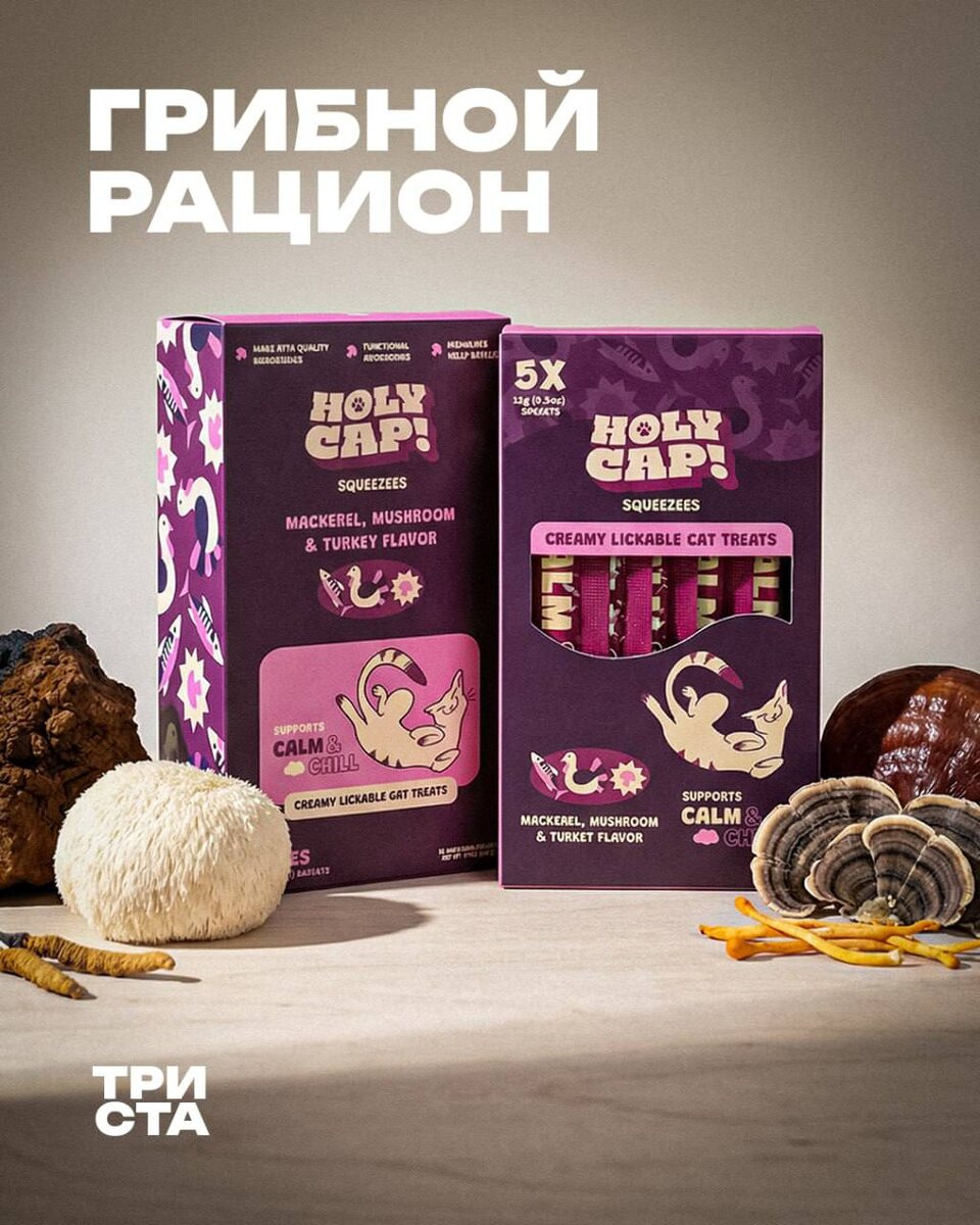 Долгое время грибы в рационе собак считались сомнительным решением. Тяжесть для пищеварения, сомнительная польза, высокий шанс ошибок с сырьем. Поэтому в лакомствах этот ингредиент долгое время обходили стороной. На рынке США появился новый бренд Holy Cap. В его продуктах грибы рассматриваются не как спорный компонент (хотя и это тоже), а как функциональная добавка в лакомствах. В составе много разных грибов: Chaga, Lion’s Mane, Reishi, Turkey Tail и Cordyceps (он вам скорее всего известен, как источник заражения зомби из серии игр и сериала Last of Us, но в реальности для людей и животных безвреден). Функциональные ингредиенты встроены в формат лакомств. Грибы используются для мягкой поддержки иммунитета, работы ЖКТ и печени, нервной системы и общего тонуса. Бренды все чаще экспериментируют с ингредиентами, которые еще недавно казались странными. При этом остается вопрос, готов ли к таким решениям наш рынок. Грибы сами по себе считаются тяжелым продуктом, а здесь речь идет еще и о