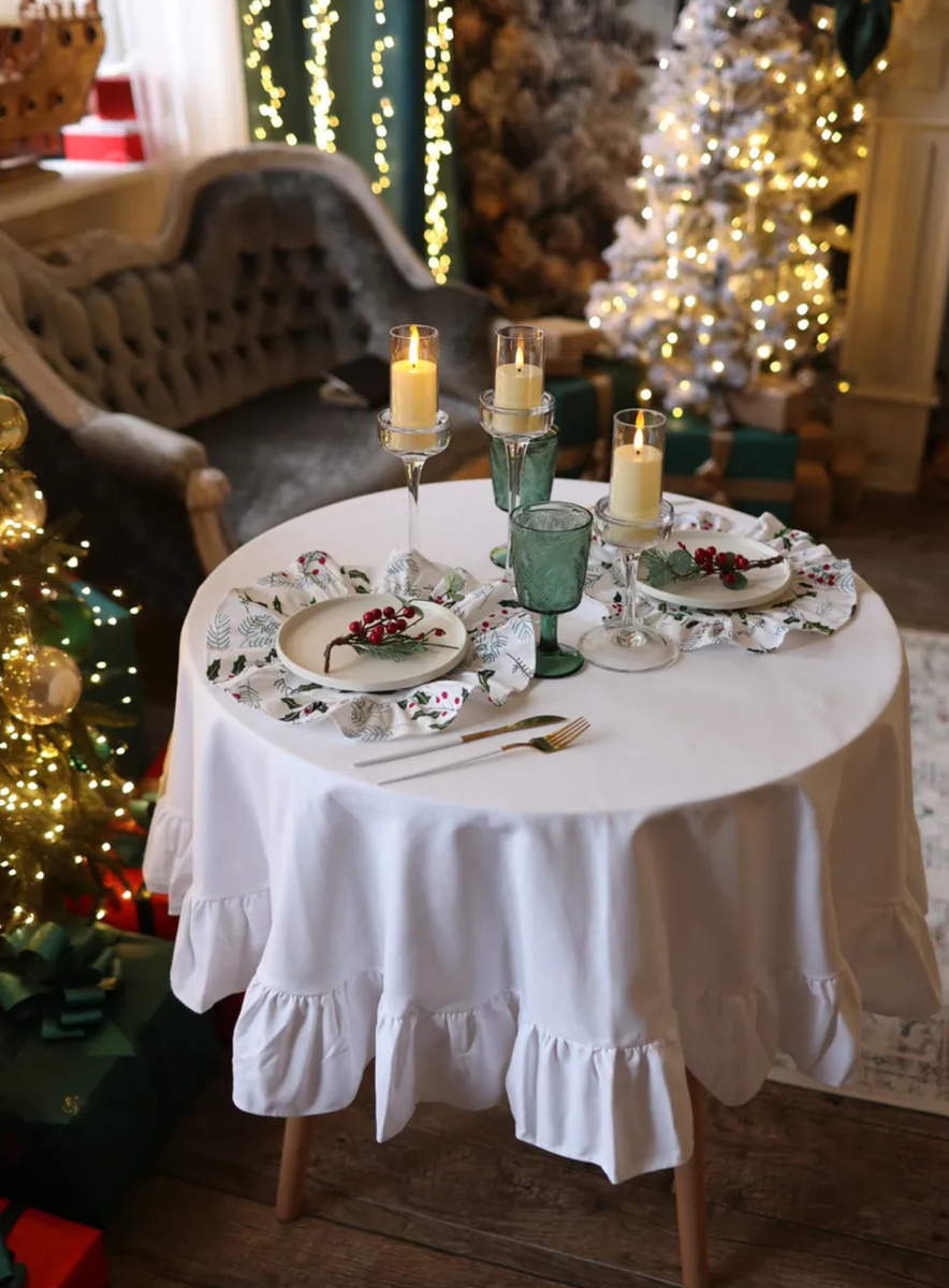 Для начала - это белоснежная скатерть, ведь куда без неё? Это основа основ. Качественная, 100% хлопок, плюс она водоотталкивающая. Создаёт уют сразу, плюс мне очень полюбились рюши, выглядит элегантно.