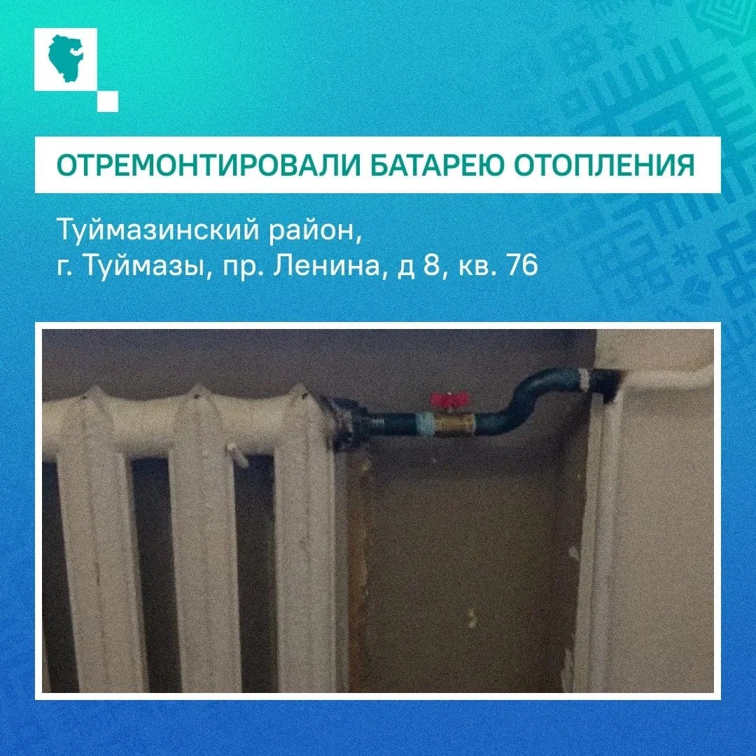 😀😃😄😁 Жительница Туймазов пожаловалась в соцсетях на подтекающую в её квартире батарею отопления. Информсистемы Центра управления Республикой Башкортостан зафиксировали обращение. К решению проблемы подключилась администрация Туймазинского района. Управляющая компания отремонтировала в квартире жительницы батарею – установили новые вентили и заменили участок трубы. 💚 ЦУР Башкортостана