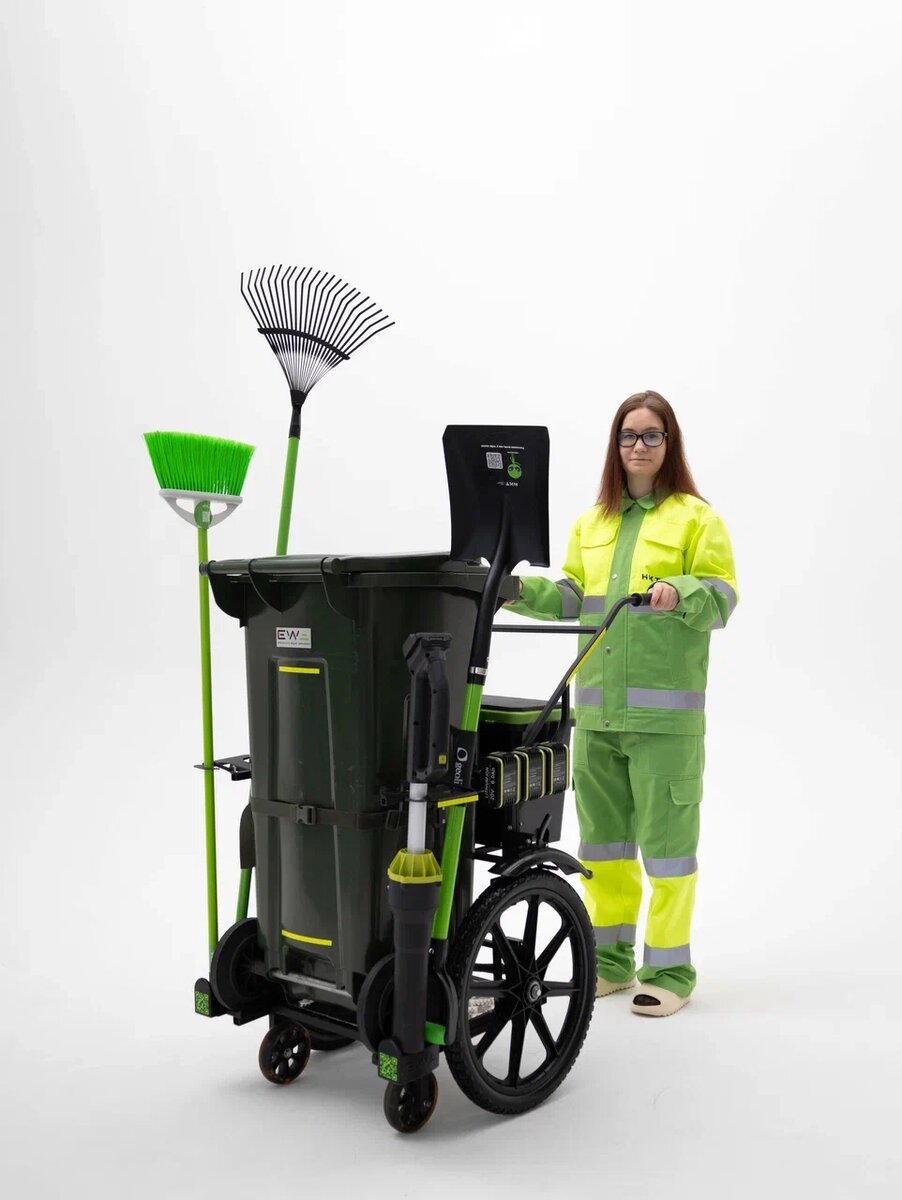 ЕВА СМ создавалась для тех мест, где важна точность и аккуратность, а не размах. Это компактная уборочная станция, рассчитанная на ежедневную работу во дворах, на тротуарах и в узких проходах между домами. Там, где каждый лишний сантиметр мешает, а каждый шаг должен быть продуман. Конструкция станции проста и логична. Инвентарь расположен так, чтобы дворнику не приходилось тратить силы на лишние движения. Метлы, совки, воздуходувка и расходные материалы находятся под рукой, а сама станция остаётся устойчивой и манёвренной даже при активной работе. ЕВА СМ не требует привыкания и не навязывает свой характер. Она сразу становится частью рабочего процесса и не отвлекает от главного — уборки. Эта станция рассчитана на одного человека и на обычный городской день, в котором нет показных жестов, но есть постоянная необходимость поддерживать порядок. ЕВА СТ отличается увеличенным объёмом и возможностью перевозить больше инвентаря и расходных материалов. Конструкция рассчитана на интенсивную экс