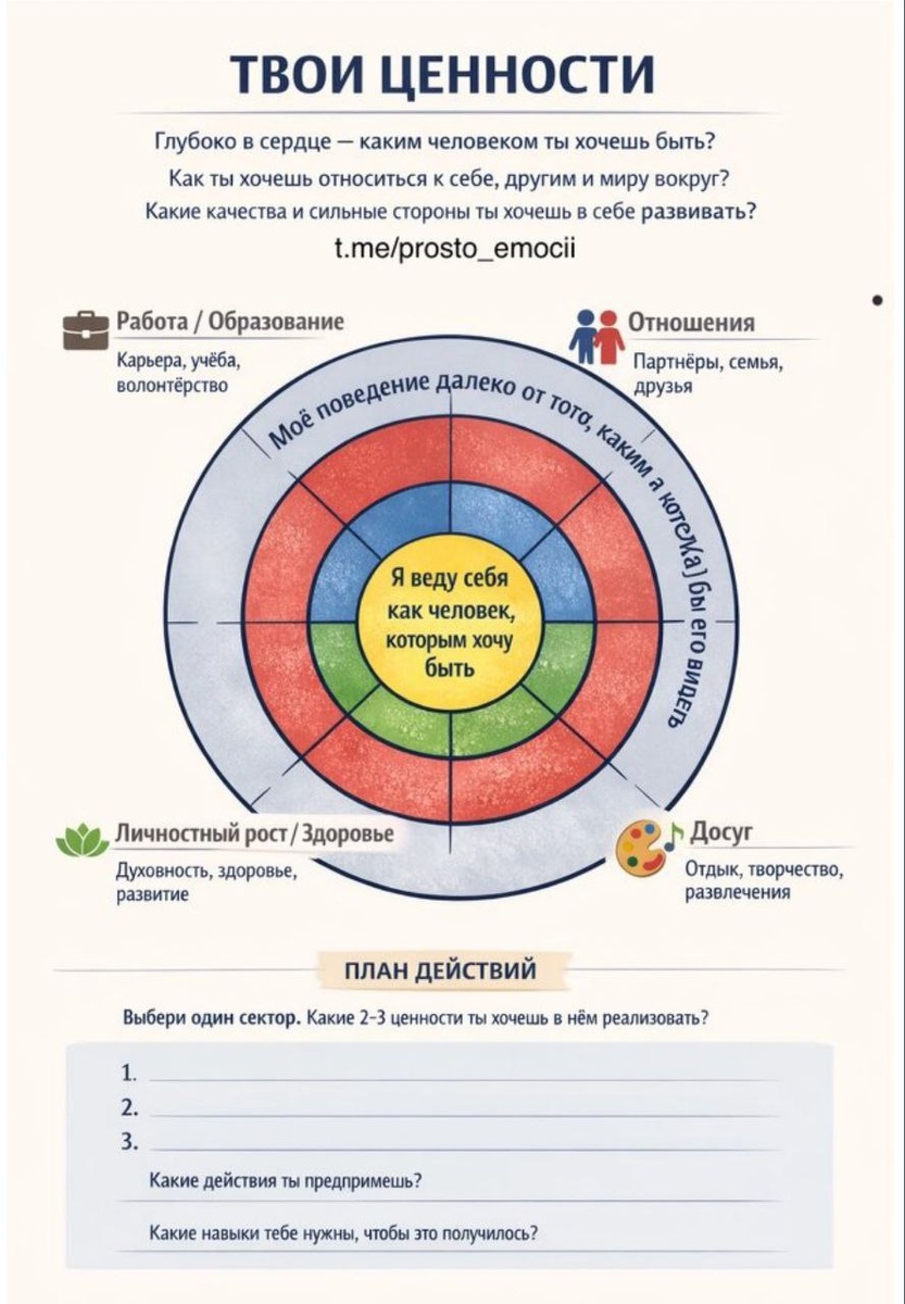 . 🎯 Где вы на мишени своих ценностей? Бывает ли у вас чувство, что жизнь будто «промахивается» мимо цели? Что вы где-то не там, не так и не с теми? На курсах по ACT-терапии (терапии принятия и ответственности) обычно прорабатывают мощную метафору - «Мишень ценностей». Это честная карта того, где вы находитесь сейчас и куда хотите двигаться. 🎯 В центре мишени - ваше ядро: «Я веду себя как человек, которым хочу быть». Чем дальше от центра - тем больше разрыв между желаемым и текущим. Четыре ключевых сектора жизни: 1. Работа/Образование 2. Отношения 3. Здоровье/Личный рост 4. Досуг Простое упражнение на 5 минут: 1. Взгляните на мишень (фото выше). Где вы сейчас? Можно оценить общую картину или взять последнюю неделю. 2. Выберите ОДИН сектор, который просит внимания. 3. Спросите себя: · Какие 2-3 ценности я хочу здесь проявлять? (Например, в «Досуге» — это радость, творчество или настоящий отдых). · Какое одно маленькое действие приблизит меня к центру? · Какой навык мне для эт