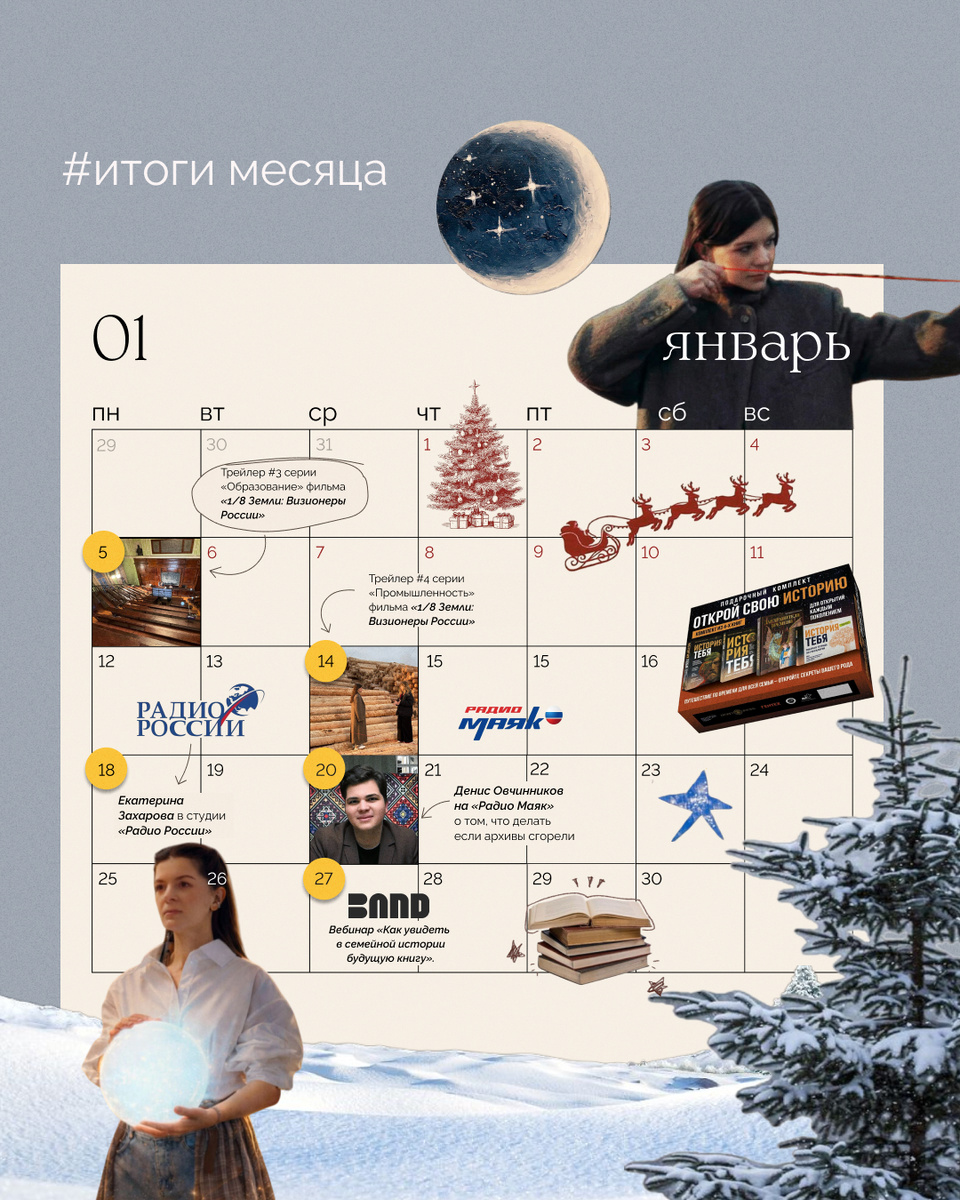 📌Январь стал месяцем ярких анонсов от проекта «1/8 Земли: Визионеры России»: вышли трейлеры сразу двух серий — «Образование» и «Промышленность». 📌18 января старший куратор генеалогических проектов Екатерина Захарова стала гостем студии «Радио России», где вместе с ведущими обсудили тему поиска предков и составления генеалогического древа. 📌20 января в эфире Радио Маяк обсудили тему «Как создать родословную, если архивы сгорели?». В роли эксперта выступил руководитель исследовательской группы Денис Овчинников. Поговорили о том, какие альтернативные источники информации можно использовать для восстановления родословной и какие данные важно собрать о каждом предке для успешного поиска. Подробнее по ссылке. 📌27 января руководитель мастерской Яна Мысовская провела вебинар для Школы писательского и сценарного мастерства Band «Как увидеть в семейной истории будущую книгу». Вместе с главным редактором журнала Psychologies.ru Александром Акулиничевым спикеры обсудили механизмы работы памяти