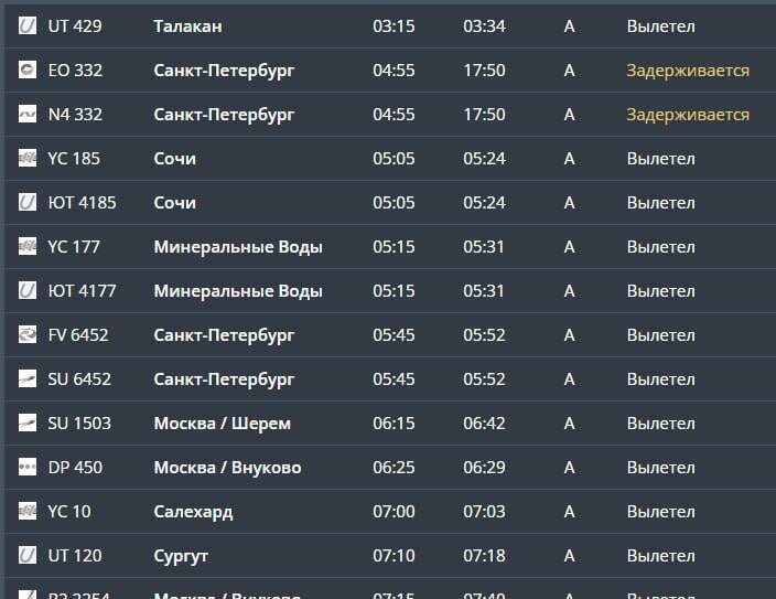 Проблемы возникли с рейсами в Санкт-Петербург и Сочи. На данный момент время задержки первого — почти 13 часов, второго — более 10 часов. Причина одна и та же — позднее прибытие самолета и подготовка самолета, сообщили в справочной службе аэропорта.