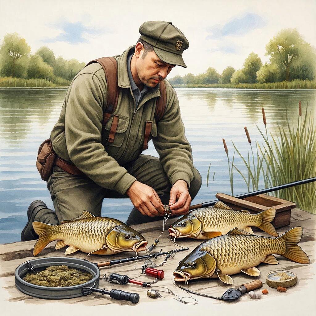Оснастка: Здесь начинается самое интересное! Самые популярные монтажи — «безопасная клипса», «инлайн» и «вертолёт». Главное правило — монтаж должен быть безопасным. В случае обрыва леска должна легко отделяться от грузила, чтобы карп не таскал его за собой.
