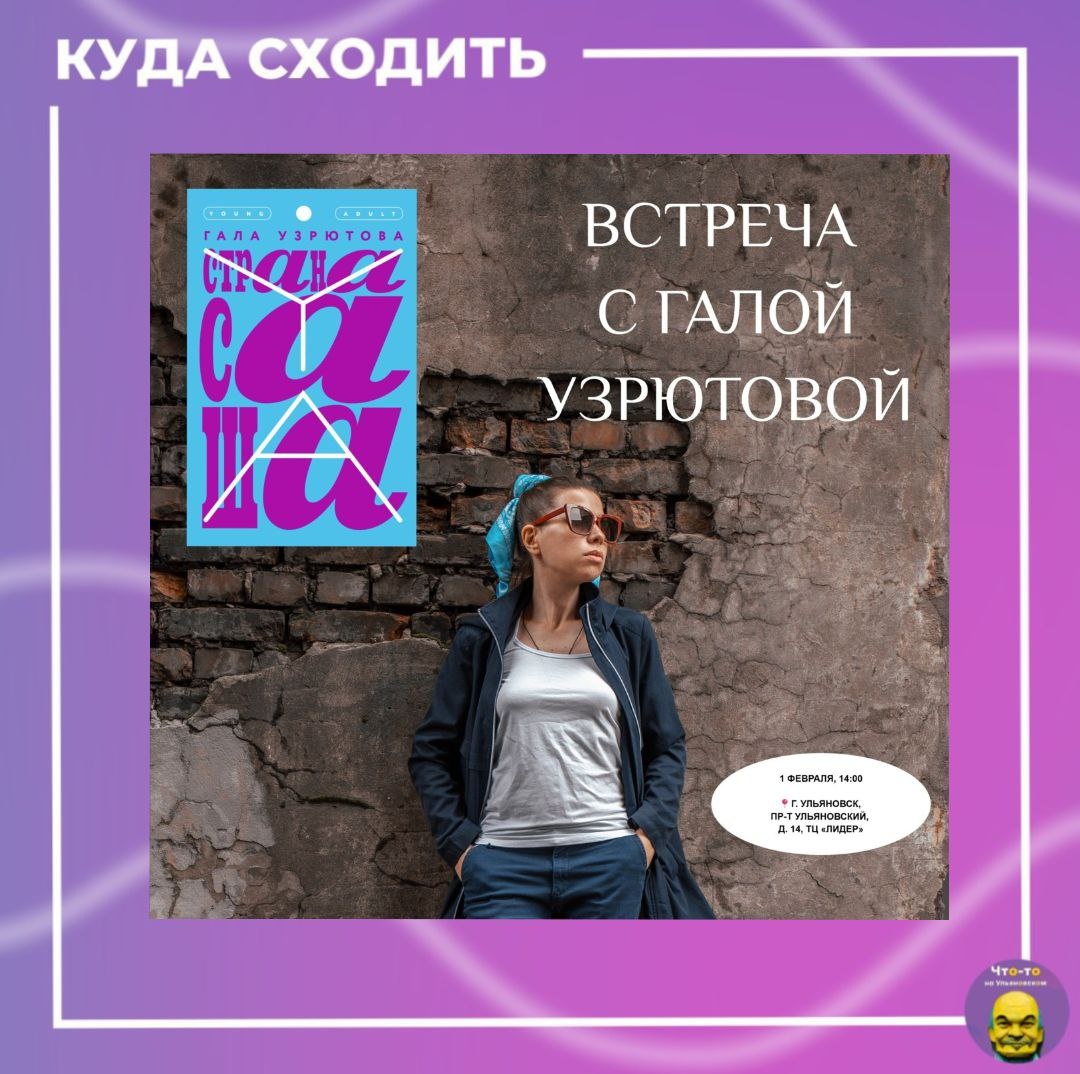 👍 Гала Узрютова – автор повести «СТРАНА САША» – нежной и честной истории о первой любви, взрослении и том самом моменте, когда вдруг открываешь: мир другого человека – целая страна. Книга вдохновила сценаристок сериала «Почка» — в 2022 году по ней сняли фильм с Марком Эйдельштейном в главной роли. Яркий, живой, как фейерверк – настоящий праздник чувств! 📅Когда: 1 февраля, 14:00 📍Где: пр-т Ульяновский, д. 14, ТЦ «Лидер» #куда_пойти_ул