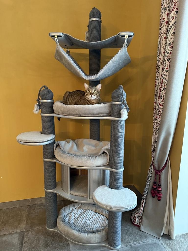 Немного про отношение к кошкам и с кошками ❤️ Приятно видеть, когда люди разделяют наши ценности. Например, что к кошке и ее потребности нужно относиться не менее внимательно, чем к потребностям остальных членов семьи ☺️ 📍У кошки должен быть свой угол, пространство, хотябы полочка в уголке над диваном 📍Все потребности быта кошки должны быть закрыты. Когтеточка это как наши гигиенические процедуры, а лежанка как кровать. Мы же не экономим на себе и не спим на "ковролинке"? 🧐 📍 Игрушки это не выдумки маркетологов и не блажь. Кошке они нужны для закрытия психологических потребностей. Как нам различные виды досуга, только еще больше. Благодарим маму Юлию за чудесные фото своего сокровища, у которого теперь есть новый домик и когтеточка ❤️ ————————- На фото комплекс Трио1м Домик в центре Лежанка норка 2 лежанки на разных уровнях Гамак с качелькой Когтеточки во весь рост Счастье для хвостика - бесценно ❤️ Дерево алюминий и серый канат Ткань #вельветлюкс45 —————————————— Подобрать