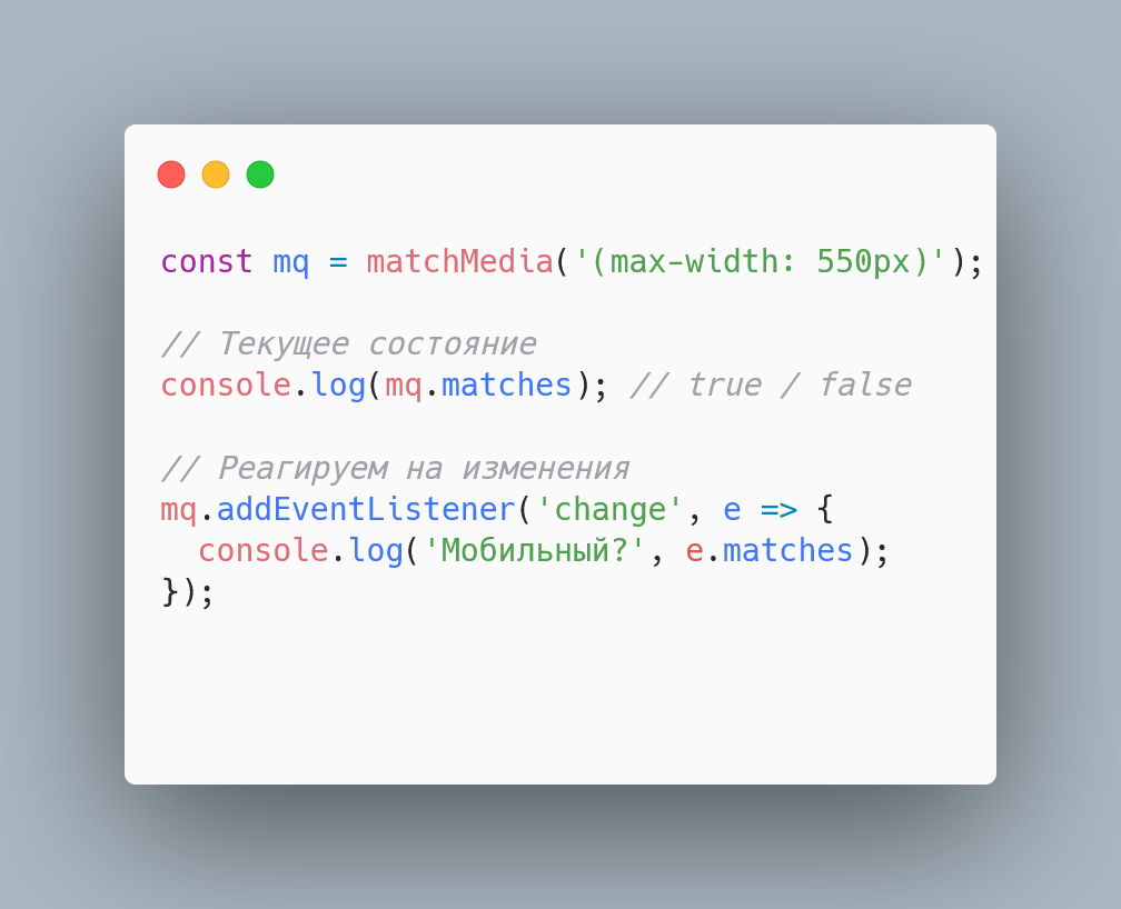 Знаешь, как в JavaScript проверить, соответствует ли текущий viewport мобильному виду? Не нужно городить window.innerWidth и слушать resize вручную. Используй matchMedia — тот же самый медиа-запрос, что и в CSS: #JavaScript #CSS #Frontend