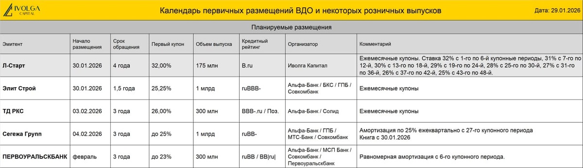 📌 Сегодня, 30 января, в 10:00 стартует размещение облигаций разработчика и производителя оборудования для нефтегазовой отрасли ООО «Л-Старт» (B.ru, 175 млн руб., ставка купона 32%, YTM 33,49%, дюрация 2,4 года). Интервью с эмитентом YOUTUBE | ВК | RUTUBE 🔸ГЛАВСНАБ БО-02 (BB-(RU), 200 млн руб., ставка купона 26,55% на весь срок обращения, YTM 30,0%, дюрация 2,5 года) размещен на 41%. Интервью с эмитентом YOUTUBE | ВК | RUTUBE 🔸РДВ ТЕХНОЛОДЖИ 1P2 (B+.ru, 250 млн руб., ставка купона 25%, YTM 26,92%, дюрация 1,64 года) размещен на 20%. Интервью с эмитентом YOUTUBE | ВК | RUTUBE