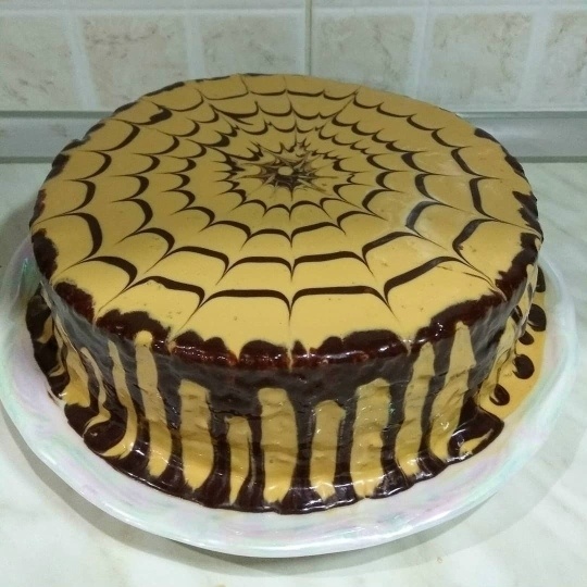 📌 Собираем тортик 🍰 .Корж , крем и т.д. Затем обмазываем верх торта и бока . Далее глазурью делаем подтёки и сверху рисуем паутинку с помощью зубочистки . Ставим торт в холодильник на 3-4 ч.