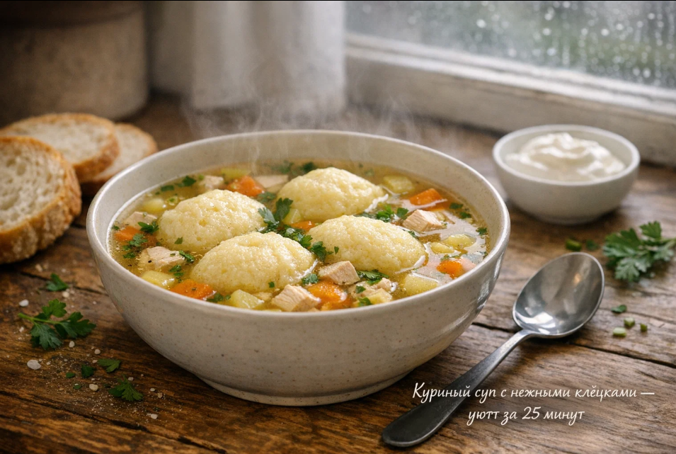 Когда за окном непогода или просто хочется чего-то домашнего и согревающего, немногие блюда могут сравниться по уюту с тарелкой горячего куриного супа. А если добавить в него нежные клёцки из манки, получается настоящее волшебство. Удивительно, но на приготовление этого кулинарного чуда уходит всего двадцать пять минут. Звучит невероятно, но это чистая правда.
