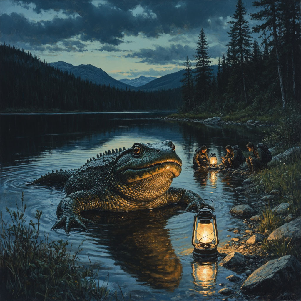 В 1997 году группа из пяти туристов отправилась в поход по Северному Уралу. Они планировали пройти по малоизученному маршруту через горные перевалы, заночевать у лесного озера, а на третий день спуститься к реке. Всё шло гладко до вечера второго дня, когда они вышли к странному водоёму — не отмеченному ни на одной карте. Озеро лежало в глубокой котловине, окружённой отвесными скалами; вода была чёрной, неподвижной, будто застывшей. Туристы разбили лагерь на каменистом берегу. Пока ставили палатки, старший группы, Виктор, заметил: на противоположной стороне, среди валунов, что‑то блеснуло — словно чешуя на солнце. Он пригляделся, но ничего не разглядел. «Может, рыба?» — подумал он, но озеро казалось безжизненным: ни ряби, ни птиц, ни даже насекомых над водой. Ночью дежурил Сергей. Около двух часов он услышал тихий плеск — будто кто‑то осторожно входил в воду. Он поднялся, взял фонарь и направился к берегу. Луч света скользнул по поверхности — и вдруг Сергей замер. Из озера медленно подн
