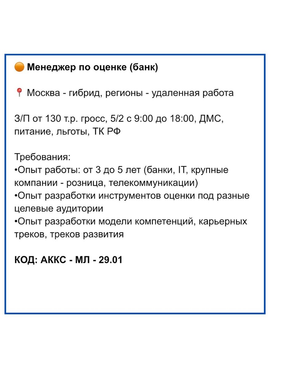 Всех поздравляю с пятницей и хорошей погодой! Вакансий сегодня - много и они - разные, что тоже радует 😊 Приятного просмотра! 🟠Фотограф (лайфстайл: спорт, еда, здоровый образ жизни) 2-3 в месяц снимать заказчику (мужчина) контент. З/П - 30-40т в месяц. КОД: АККС - ЛА - 26.01 🟠Инженер - конструктор (инновационное производство полного цикла комплектующих для станкостроения), от 150 000 (Владимир) Условия: компенсация аренды жилья, питание, командировки в Китай, обучение, лучшие технологии Требования: Чтение чертежей, ТД, разработка ТЗ, проектной документации, AutoCAD, Компас-3D, Технологии машиностроения, приборостроения, металлургии КОД: АККС - Н - 28.01 🟠Финансовый контролер 📍Москва с релевантным опытом работы от 3х лет . З/П обсуждается, годовая премия, ДМС, зоны отдыха и массажные кресла, гастрономический вайб по пятницам и фруктовые дни по понедельникам и другие плюшки Ключевая задача: участие в бюджетировании и подготовка консолидированной управленческой Отчетности Холдинга