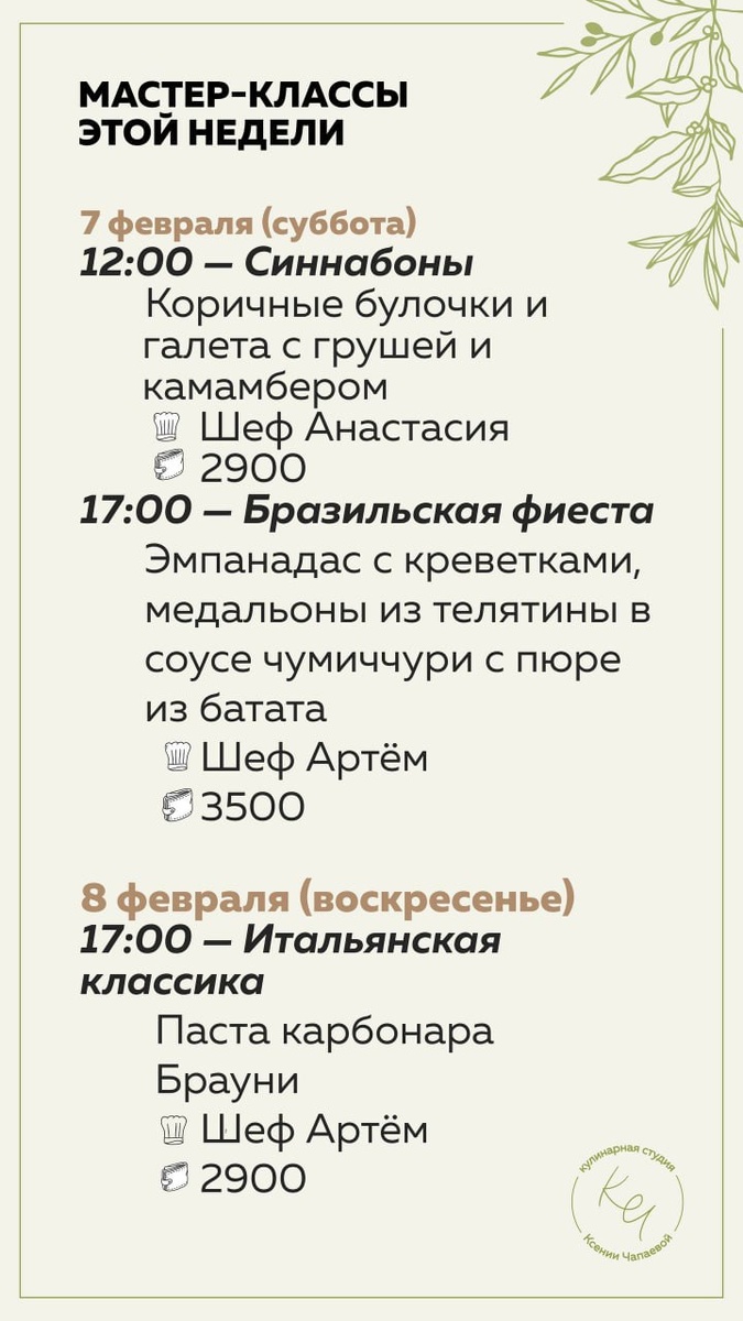 ? 🍳 Да? Тогда вам точно стоит посетить мастер-классы в кулинарной студии Ксении Чапаевой!) #идёмплатно весь февраль ➡️ Запись через @kitchen_studio_admin Каждый день вас будут ждать новые сюрпризы от организаторов и знания, которые пригодятся не только дома, но и за его пределами!) ✍️ На мастер-классах приготовим: — эмпанадас с креветками; — шоколадная колбаса с печеньем; — тартар из говядины и много другое. Полное расписание по ссылке. Не забудьте подписаться на наш канал ❤️