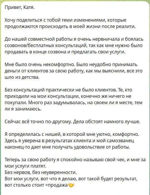 ” Мне очень тепло от её сообщения, потому что в нём видно, как меняется рамка восприятия, когда наш ум становится спокойнее, а шаги — регулярнее, без надрыва и без самоистязаний. Лена пишет, что, пользуясь моими советами по позиционированию и продвижению, она стала регулярнее и структурнее вести канал. А благодаря этому пошли регулярные запросы на разборы. За прошлый месяц у неё получилось примерно так: — около 20 разборов — 5 человек зашли в работу, и спокойно, без лишних вопросов оплатили. И для меня это история не про то, “как Лене повезло”, а про рабочую связку, которую мы с ней выстроили и закрепили — ведь после реалити мы продолжили совместную работу. Мы собрали и внутреннюю часть, где раньше было много напряжения вокруг денег и продаж, и внешнюю часть, где нужна была понятная система, чтобы не распыляться. Сейчас Лена открывает онлайн-школу английского с носителями, набирает преподавателей, и параллельно развивает направление Авито, помогает коллегам настраивать поток клие