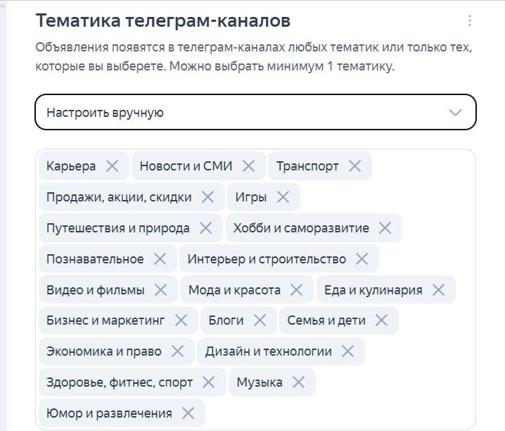 Реклама через Яндекс Директ, размещение в ТГ каналах. #личныйопыт Итак, что было сделано, протестировано, какие выводы получены. Имеем: Бизнес ТГ канал на 50 подписчиков Цель: Разогнать канал, увеличить число подписчиков Тест: Размещение рекламного объявления на широкую аудиторию. 🕊️Россия 🕊️М и Ж 🕊️Тематики каналов почти все из возможных (см. Скриншот выше) 🕊️Корректировки ставок по подписчикам Результат: 50 подписчиков за 5 дней за 10000р+ндс, 1 заявка в работу Оценка результатов: Плюсы: 🕊️Яндекс Директ (реклама в тг) рабочая площадка 🕊️дешевле чем Telegain за размещение 🕊️За 10000р получили размещение на 107 каналах (юмор+игры+немного новости) 🕊️Корректировки на платежеспособную аудиторию привели 2-5℅ Минусы: 🕊️невозможно выбрать конкретные каналы, только тематику 🕊️нельзя выбирать все тематики разом, на маленький бюджет берёт только 2 и их отрабатывает. Остальные в тесты не попали 🕊️сложно оценить качество аудитории 🕊️нет статистики каналов 🕊️на каждом канале р