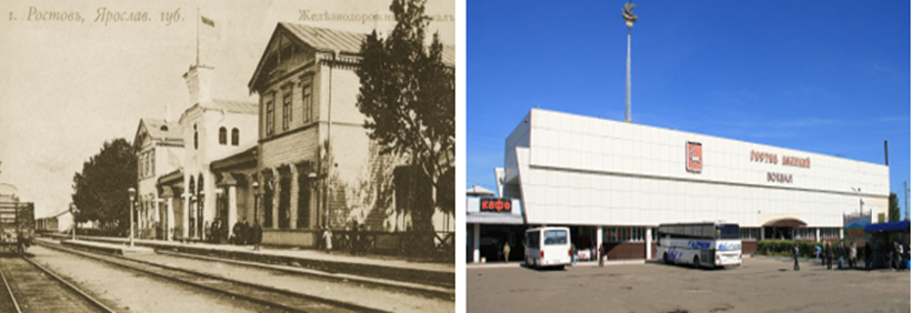 Станция Ростов-Ярославская в начале двадцатого века. Современный вокзал в Ростове Великом, построенный в 1975 году.