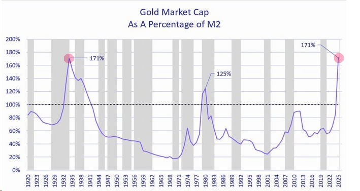 Рыночная капитализация золота в процентах от денежной массы M2 выросла до максимума с 1930х годов и значительно превысила уровни 1970х