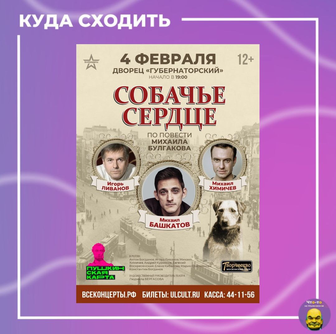 " 🎭 Кто виноват в истории очаровательной собачки? Профессор Преображенский или комиссар Швондер? А сам Шарик — злая псина или малый ребенок, которого втемную использует и медицина, и представители власти?! Ответ на эти и другие вопросы можно получить, посмотрев пронизанный иронией и юмором спектакль в постановке замечательного режиссера Валерия Саркисова. 📅Когда: 4 февраля в 19:00 📍Где: ДК "Губернаторский" (ул. Дворцовая 2/13) #куда_пойти_ул