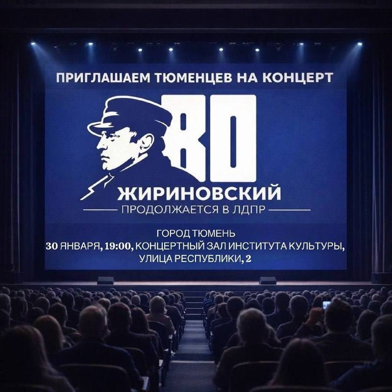2026 год ознаменован важной датой — 80-летием со дня рождения Основателя ЛДПР, выдающегося политика современности Владимира Жириновского. Владимир Жириновский всегда был ценителем нашей русской культуры, ценителем искусства и искренним патриотом. В этот вечер мы вспомним его путь, его пророчества и его безграничную любовь к России. 🎶 В программе вечера: • Выступление именитого коллектива «Камерата Сибири» под руководством Фаузии Тайжиной; • Творческие номера от местных артистов; • Уникальная фотовыставка, посвященная жизни и политической деятельности Владимира Вольфовича Жириновского 📍 Где: Тюменский государственный институт культуры (улица Республики, 2). 📅 Когда: 30 января 2026 года. 🕖 Начало: 19:00.