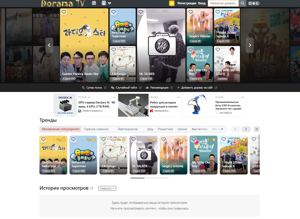 Один из известных сайтов с дорамами в России - DoramaTV.live, который с завидной периодичностью меняет свои домены, но неизменно выглядит так, как на скриншоте.