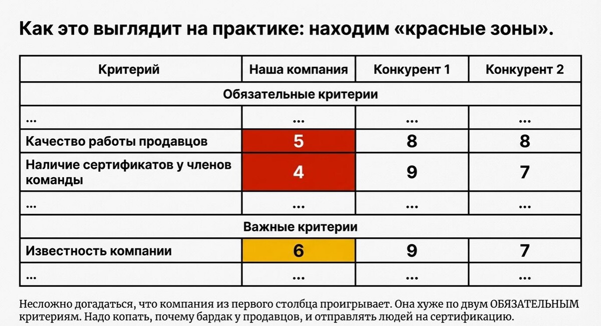 Методика предназначена для быстрого (1–2 дня) и честного аудита компании, чтобы ответить на вопрос: «Почему клиенты выбирают не нас в это трудное время?». Необходимо составить таблицу, разделив критерии выбора продукта на три группы. Важно формулировать их исходя из реального поведения клиентов, а не их деклараций. В таблицу добавляются основные конкуренты. Себе и им выставляются оценки по шкале от 1 до 10: На этом этапе оценивается положение компании относительно клиентов и конкурентов. Например: Полученная таблица с «красными зонами» становится готовым планом действий. В приоритет ставятся задачи, которые: Многие критерии связаны (например, «репутация компании» <-> «наличие отзывов» <-> «присутствие в медиа»). Исправление одной корневой проблемы может автоматически улучшить оценки по 2–3 пунктам. Методика позволяет отсеять бессмысленные маркетинговые активности и сфокусироваться на том, чего действительно не хватает клиенту для совершения сделки.