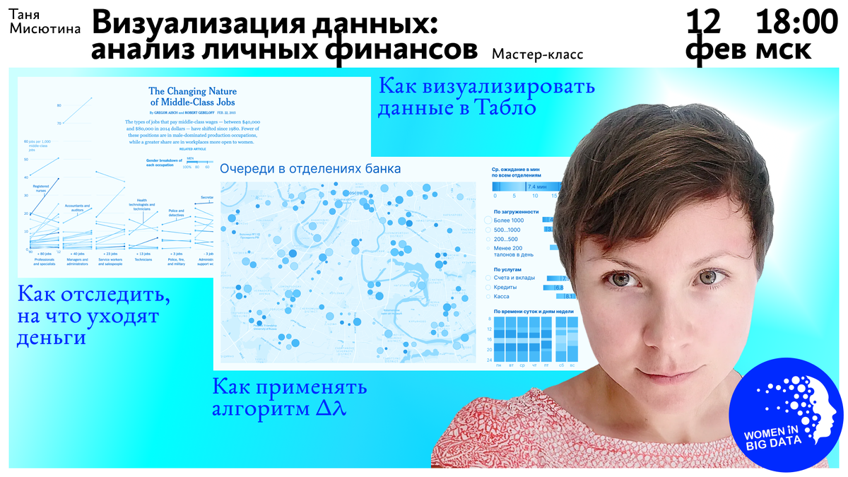 В четверг 12 февраля в 18:00 мск Таня Мисютина проведёт бесплатный мастер‑класс по анализу личных финансов с помощью визуализации в Табло совместно c «Девушками в больших данных» — сообществом для поддержки и развития специалистов в области больших данных и аналитики. Таня — преподаватель в Школе дизайнеров и автор курса «Визуализация данных». Таня познакомит слушателей с шагами алгоритма визуализации сложных данных, и тут же применит эти шаги на примере датасета с личными финансами. Соберёт в Табло дашборд, который ответит на важные вопросы о доходах и тратах, и поможет участникам мастер‑класса повторить его для собственных данных и с учётом личных запросов. Уже на мастер‑классе вы узнаете: Мастер‑класс будет интересен тем, кто интересуется представлением информации и визуализацией количественных и качественных данных, а также всем, кто хочет погрузиться в анализ своих финансов. Промокод на курс «Визуализация данных» и куча бонусов к участию. Чтобы записаться на мастер‑класс присоедин
