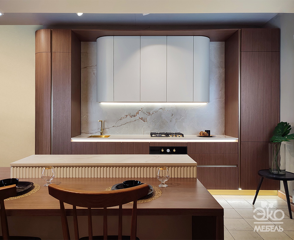 Представляем вашему вниманию новинку от компании Экомебель — кухню "СЕЛЕНА" мультишпон с элегантными радиусными фасадами. Гармоничное сочетание фасадов в благородном кофейном оттенке (550С) и нежных ванильных тонах создаёт тёплый, сбалансированный образ, который легко впишется в современный интерьер. Столешница и стеновая панель выполнены из ламинированной ДСП от компании Ligron в цвете «Малевич». Природный рисунок каменной поверхности подчёркивает премиальность кухни и добавляет интерьеру выразительности. Кухня СЕЛЕНА оснащена всем необходимым для комфортного использования: функциональные выдвижные элементы, вместительные ящики и шкафы позволяют удобно организовать пространство для хранения. Композицию визуально завершают радиусные фасады, которые смягчают геометрию кухни, визуально облегчают её и делают интерьер более современным и стильным. Для максимальной эстетики и удобства используются ручки gola-профиль, подчёркивающие лаконичный дизайн и чистоту линий. Особая изюминка модели