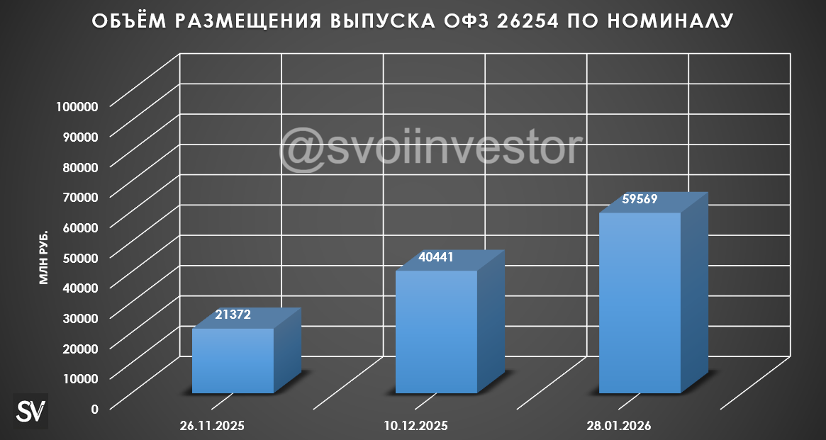 Минфин провёл аукцион ОФЗ, предложив инвесторам два выпуска. При его проведении индекс RGBI находился ниже 117 пунктов, с учётом инфляционных данных и переговорного трека индекс подрос — 116,71 пункта: 🔔 По данным Росстата, за период с 20 по 26 января ИПЦ составил 0,19% (прошлые недели — 0,45%, 1,26%), с начала месяца 1,91%, с начала года — 1,91% (годовая — 6,43%). Темпы января продолжают находиться на высоком уровне (эффект от повышения НДС, тарифов РЖД), но они замедлились относительно прошлой недели: подорожание цен на бензин замедлилось, дефляция в технике (спасибо крепкому ₽), однако рост цен на плодоовощную корзину продолжился. При таких темпах января мы выйдем на 2% по месяцу — это более 20% saar (месячная инфляция без сезонных факторов, умноженная на 12), то есть за один месяц план ЦБ будет выполнен наполовину (ожидают 4-5% по году, но не забываем, что в октябре будет сверх повышение ЖКХ), проблема ещё в том, что в месячном пересчёте будет учтён рост ЖКХ на 1,7%. 🔔 В 2026 г.