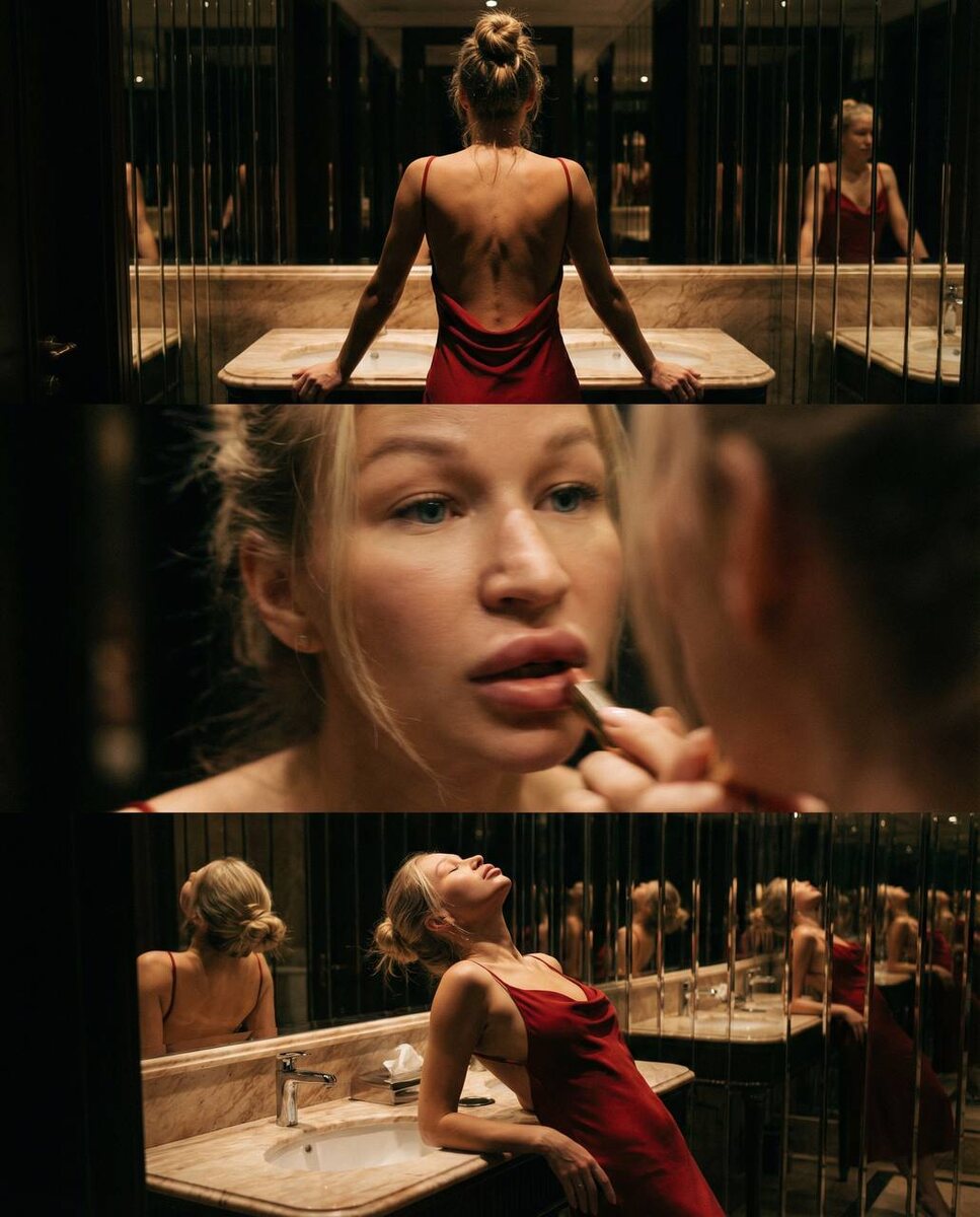 ♥️ Как повторить со своим фото: 1. Заходите в этот бот 2. Нажимаю - Нейросети 🧠 3. Нажимаю - Nano Banana 🍌 4. Нажимаю - Nano Banana Pro 5. Нажимаю - 2K или 4К 6. Выбираю формат - 9:16 7. Добавляю свое фото в анфас, с хорошим освещение и вставляю этот промт 👇 Кинематографичный триптих в зеркальном туалете дорогого ресторана, вечер, интимный свет, отражения, ощущение пойманного момента. Единый образ и настроение, лёгкое зерно и motion blur, ультрареализм без глянца. Верх: девушка спиной опирается на раковину, лицо в тени, освещена спина; красное платье с открытой спиной, небрежный пучок, драматичный силуэт. Центр: экстремальный крупный план лица в зеркале — поправляет помаду, живое движение, частичный фокус. Низ: голова запрокинута, глаза закрыты, расслабленная поза у раковины, тот же образ. Свет мягкий, глубокие тени, насыщенные сдержанные цвета. Черты лица сохранить 1:1 (глаза, нос, губы, овал). Отправляй подруге: @korolkova_lab ♥️