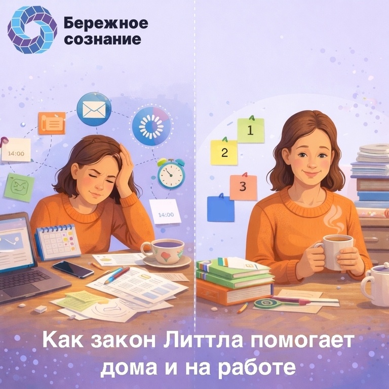 Иногда кажется: чем больше задач в списке, тем продуктивнее день. Но к вечеру ты будто выжат, а толком – ничего не закончил. Знакомо? На самом деле, перегруженность задачами только мешает. Об этом говорит закон Литтла: чем больше дел одновременно в работе, тем дольше каждое из них будет завершаться. Получается не «много и быстро», а «всё сразу и ни одно до конца». Попробуйте сократить количество активных задач. Вместо десяти пунктов в списке – три, максимум пять. Лучше сделать меньше, но качественно и с ощущением завершённости, чем бросаться между делами и не видеть результата. 📌 Рабочий пример: Если вы менеджер, не надо ставить себе 20 задач на понедельник. Сфокусируйтесь на 3 приоритетах, а остальное отложите. Вы удивитесь, как быстро продвигаются дела. 📌 Бытовой пример: Не надо мыть окна, разбирать шкаф и готовить на неделю в один день. Выберите одну задачу, сделайте с удовольствием – и на этом остановитесь. 💬 Бережное сознание – это умение слышать себя, замечать усталость и
