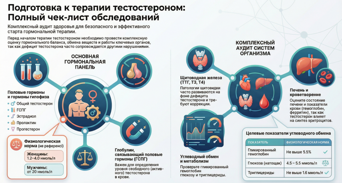 Перед началом терапии тестостероном необходимо пройти комплексное обследование всех основных биологических систем организма. Это важно для исключения противопоказаний, выявления сопутствующих нарушений и последующей персонификации дозировки. Оптимальный чек-ап подбирается индивидуально и в основном включает следующие обследования: Это ключевой блок для оценки текущего уровня половых гормонов и работы гипоталамо-гипофизарной системы: Нарушения в этой системе часто являются причиной ожирения и системного воспаления: Необходимо для исключения анемии и оценки реологии (текучести) крови: Если планируется классическая менопаузальная терапия (МГТ) или необходимо исключить патологии эстрогензависимых тканей, требуются: Правила сдачи анализов: Все анализы смотрит врач и дает вам интерпретацию Самоназначение ГОРМОНОВ НЕ ДОПУСТИМО! ====================================================== Подписывайся на мой телеграм канал, чтобы узнать о том, как получить помощь моего врача, который помог мне и