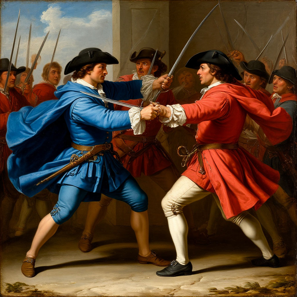 (Шестеро мушкетёров выходят из трактира и идут боком вдоль сцены двумя рядами, в первом ряду Арамис, Портос и де Фьерваль, во втором ряду де Лорм, де Шантен и Атос) ПОРТОС Славный был поросёнок и отличное вино! Люблю этот трактирчик. Недорого и вкусно. АРАМИС Только народу иногда многовато в нём. Кажется, наш разговор подслушивали гвардейцы кардинала. Они посматривали на нас с большой неприязнью. ПОРТОС Что же вы мне не сказали? Мы бы с ними поговорили по-свойски. АТОС Кажется, они не склонны были к стычке, тихо-мирно ушли. АРАМИС Это-то и настораживает. (За спиной мушкетёров появляются шестеро гвардейцев кардинала, они выхватывают шпаги и бросаются с ними на мушкетёров со спины без предупреждения. Де Лорм, де Шантен и Атос падают сражёнными ударами в спину, успев вскрикнуть. Арамис, Портос и де Фьерваль обнажают шпаги и оказывают сопротивление, начинается сражение. Атос дважды пытается подняться, но без сил падает) ПОРТОС Негодяи! Нападать со спины! На! Получай! (Гвардейцы окружают му