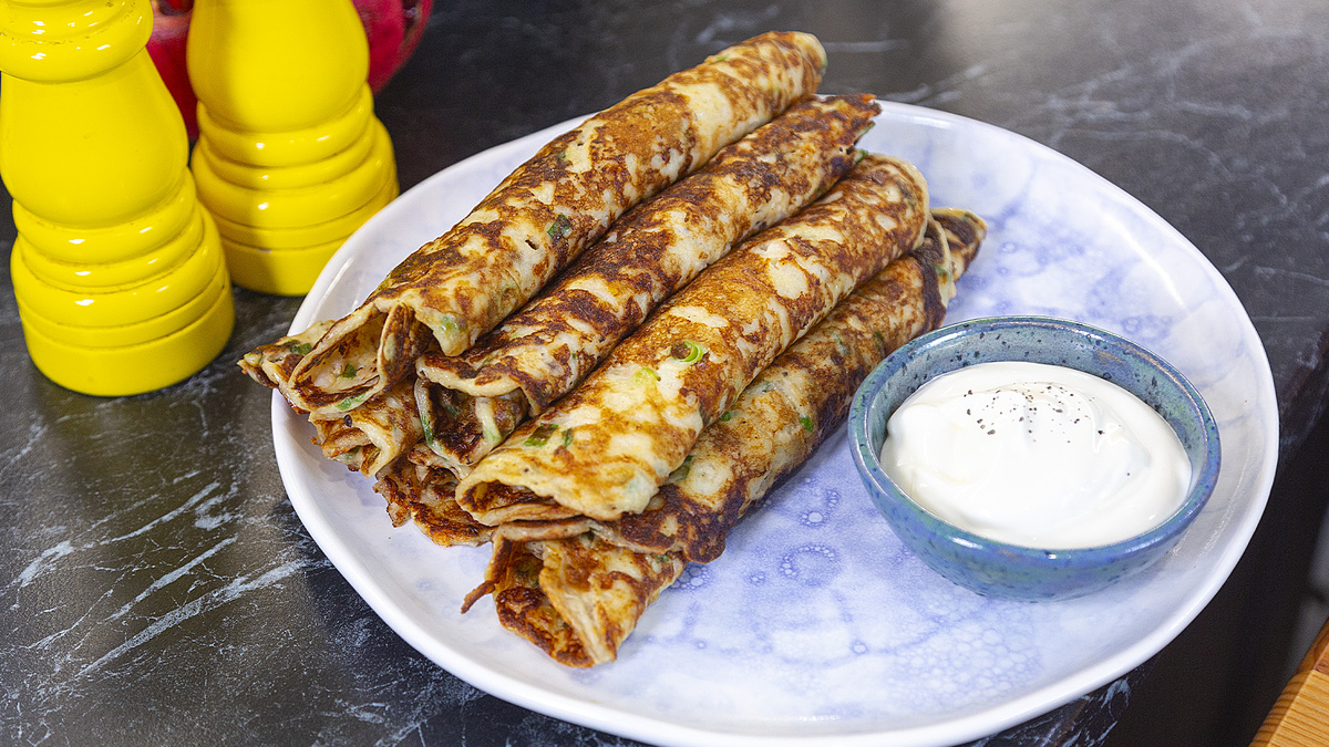 Ингредиенты: Приготовление: Куриное мясо мелко порубить в фарш. Сыр натереть, зел. лук нарезать. В миску: яйцо + лук + соль + перец → перемешать. Добавить сыр + фарш + сода + мука + мелкий имбирь → вымесить. Влить кефир + соевый соус → хорошо размешать до теста консистенции густой сметаны. На разогретую сковороду с маслом выкладывать ложкой лепёшки. Жарить с двух сторон до золотистой корочки. Готовые лепёшки на бумажное полотенце → свернуть трубочкой. Подавать со сметаной.